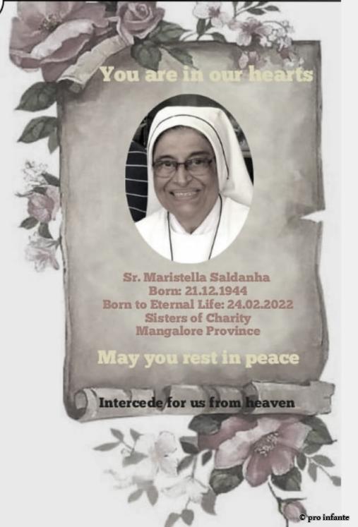 Aus Indien erreichte uns die traurige Nachricht, dass Sr. Maristella am vergangenen Donnerstag, dem 24. Februar 2022 nach kurzer Krankheit plötzlich verstorben ist. Sr. Maristella war seit der Gründung von pro infante eine liebe und wertvolle Wegbegleiterin, die wir sehr vermissen werden. Möge sie in Frieden ruhen.